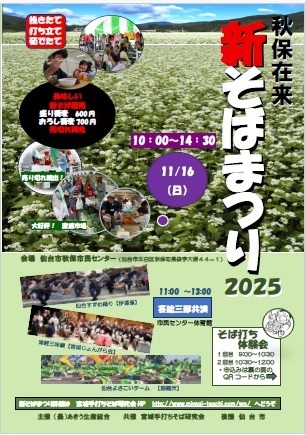 秋保在来 新そばまつり ポスター完成 2025年10月17日 admin コメントする 11月16日(日)に開催予定の「秋保在来 新そばまつり」ポスターが完成しました。皆さまのご来場をお待ちしております。 ポスター・チラシ2025 5_表面 ポスター・チラシ2025 5_裏面